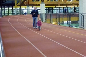 drei Runden auf der 200-Meter-Indoor-Laufbahn!