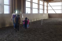 Beim Hinbringen sahen wir, wie Tina ungeduldig im Stuhlkreis auf die Begrüßung der Reitlehrerin wartete.