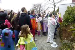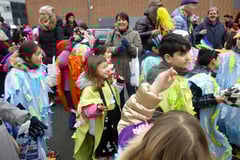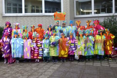 Auf dem Schulhof wurden die bunten Vögel noch einmal eingefangen für ein gemeinsames Foto und dann ging es los zum großen Karnevalsumzug.