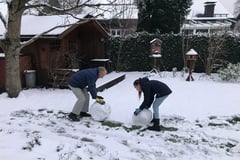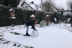 Warm angezogen stürmten die beiden in den Garten und fingen mit ihrem Schneemann-Projekt auch gleich an. In Windeseile schafften die beiden es, einen tollen Schneemann zu bauen und hatten dabei noch sichtlich Spaß.