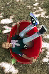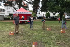 Beim Spielefest trat Tina in den sportlichen Wettkampf mit Mama und Papa und besiegte beide in fast jeder Disziplin: Körbe werfen, Sackhüpfen, Stelzenlauf, Vier gewinnt.